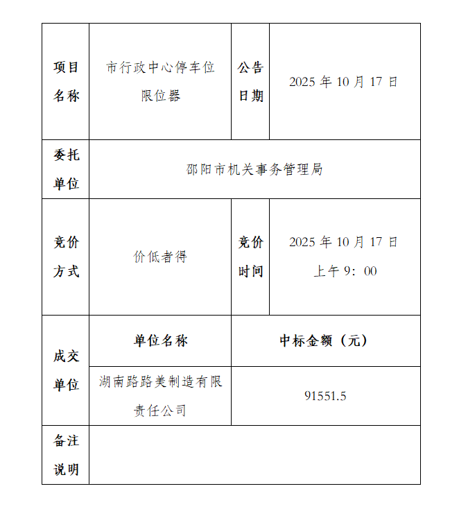 市行政中心停车位限位器采购公开竞价结果公告