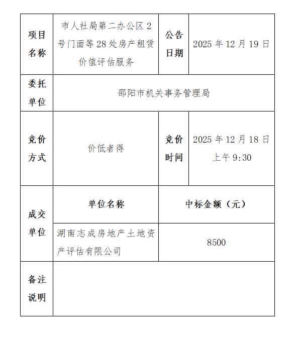 市人社局第二办公区2号门面等28处房产租赁价值评估服务结果公告